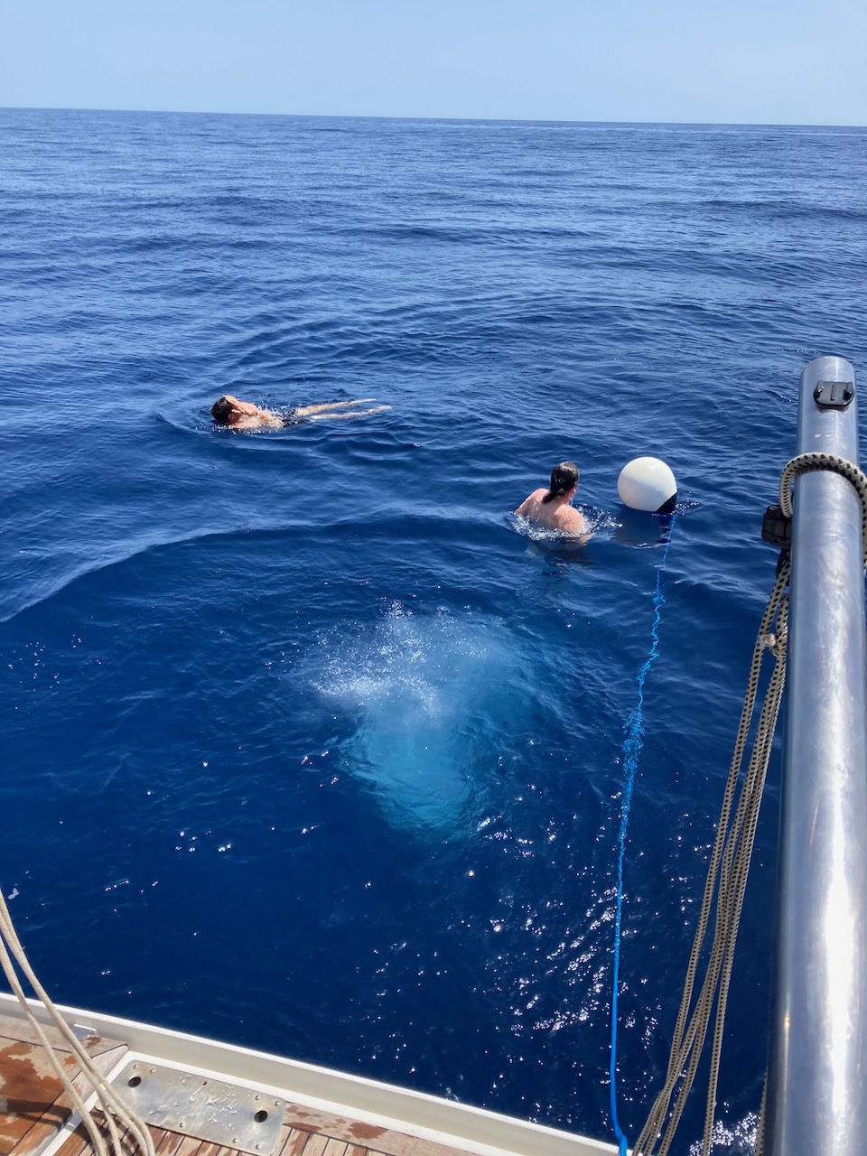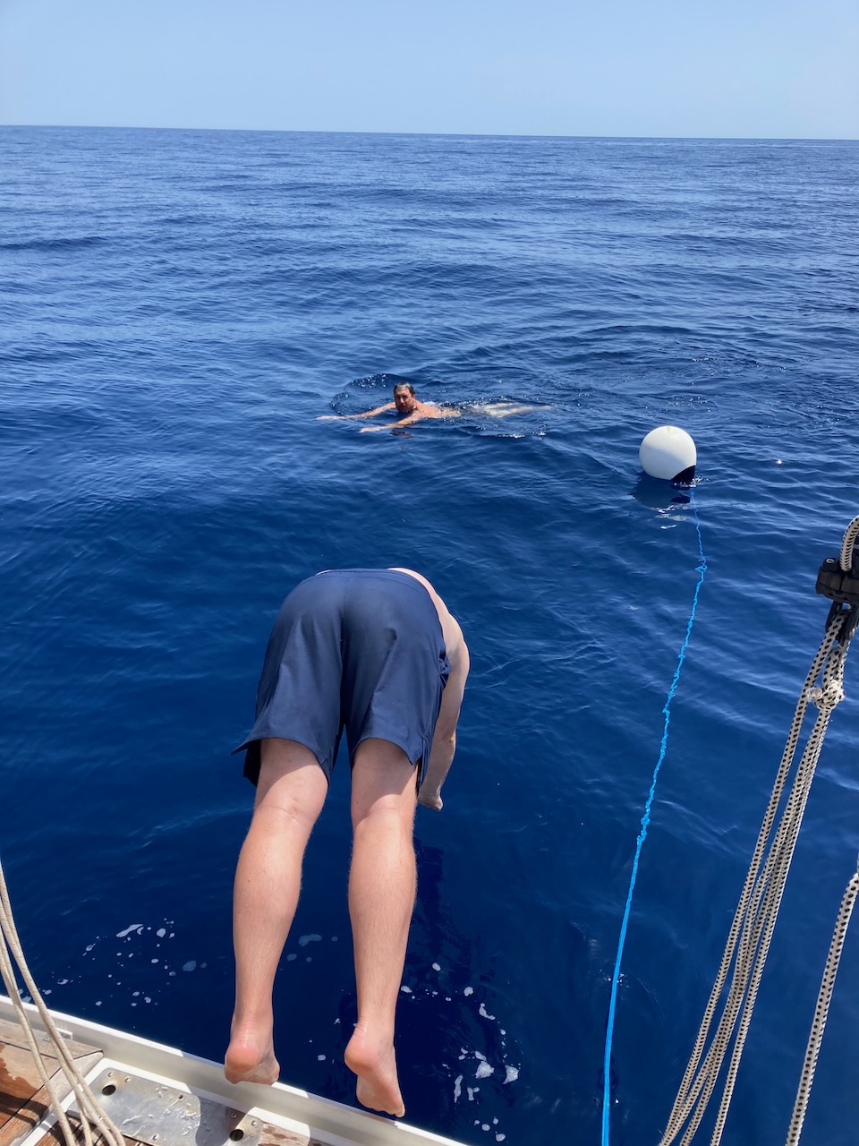 Det gik dog op for os, at vi manglede at få sat flueben ved at springe i det åbne hav fra Jennys badepladeplatform. Så i 0 m/s vind og blankt vand blev der smidt en fender med line i vandet, og lige bagefter den sprang skibskokken og jeg, mens resten blev i båden og sørgede for, at den ikke stak af.